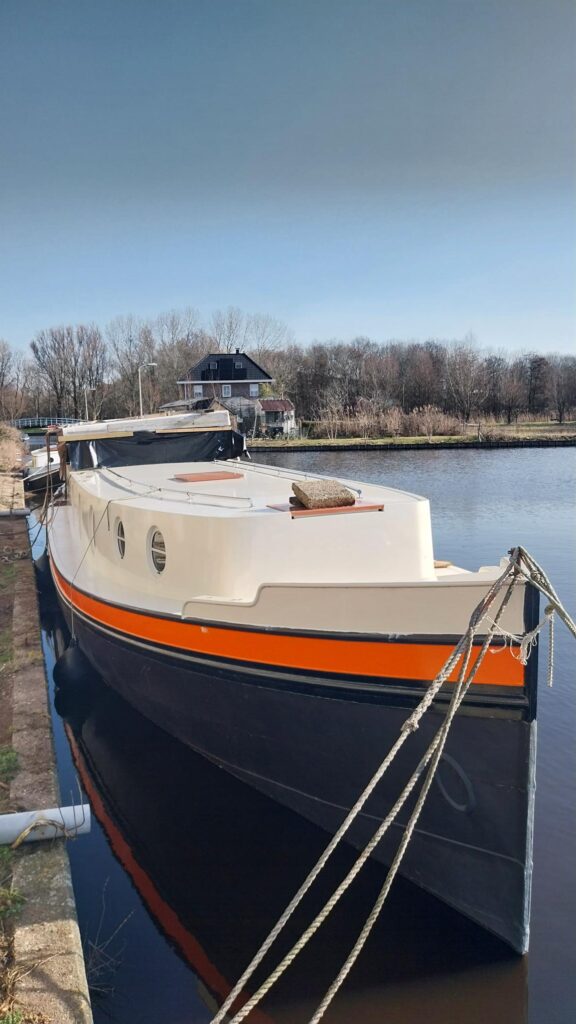 Deze oude dame is meer dan 100 jaar oud en we weten niet helemaal waar ze vandaan komt. In Amsterdam had je vroeger “Directie vaartuigen” en daar heeft ze wel wat van weg. Het mooiste aan dit schip is de achterkant. Een mooie “kont” die uit het water ophoog komt. Jan heeft er heel wat uurtje in zitten, om Jane te restaureren. Bijna elke stuk is vervangen door nieuw staal en alleen al in de strippen aan de zijkant zit heel veel uren laswerk.